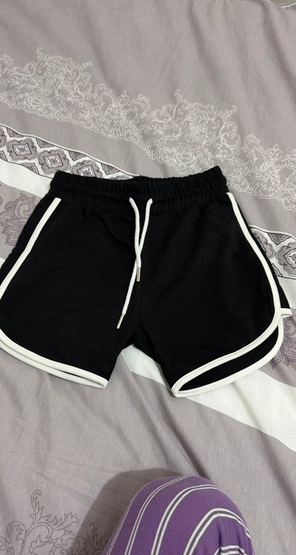 Pamuk kumaştan yapılmış, elastik bel ve beyaz yan şeritlere sahip siyah mini şort. Spor ve günlük sokak stili için uygundur.