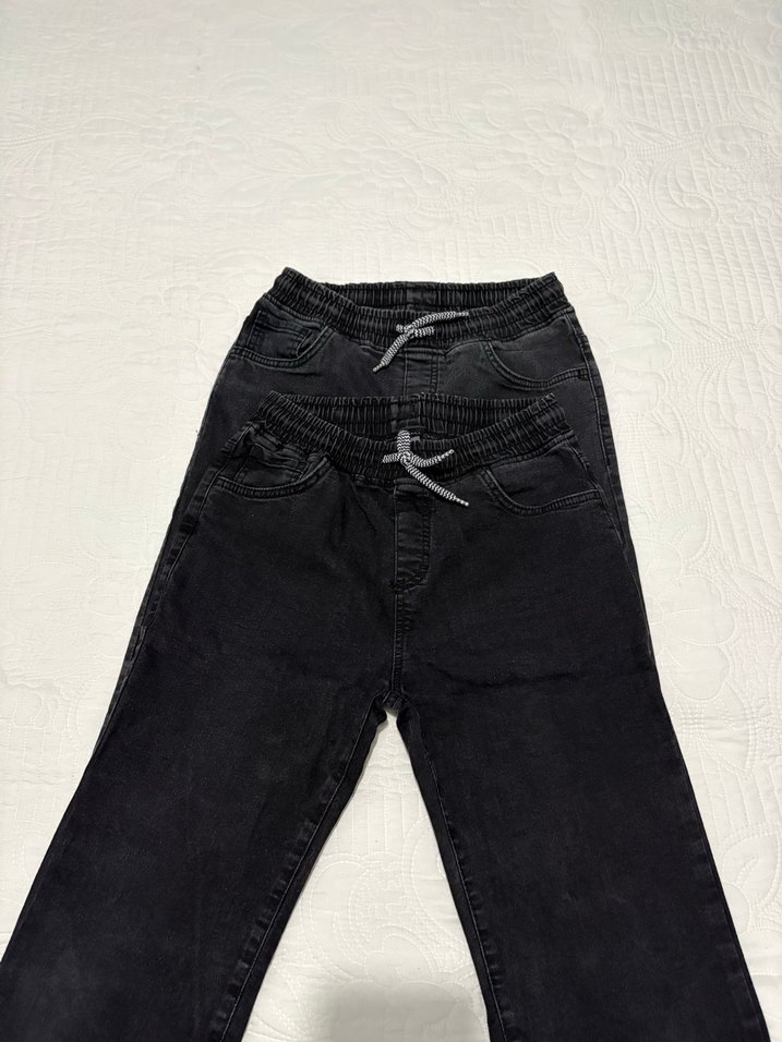 Siyah denim kumaştan, elastik bel ve rahat kesime sahip, günlük kullanıma uygun rahat sokak stili jeans. Biri 10-11 yaş aralığı / diğeri 12-13 yaş aralığı. Hiç kullanılmadı. 2 si tek fiyat.