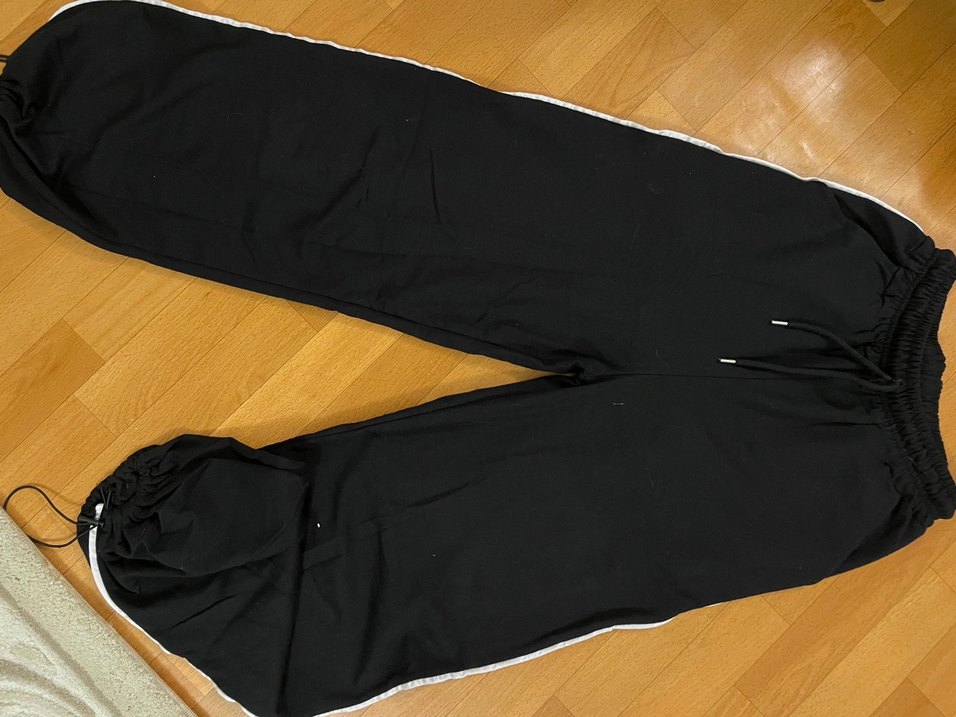 Siyah, elastik belli, normal midi uzunlukta, yumuşak sentetik kumaştan kadın spor pantolonu. Rahat ve şık sokak stili için uygundur. paçaları lastik detaylı