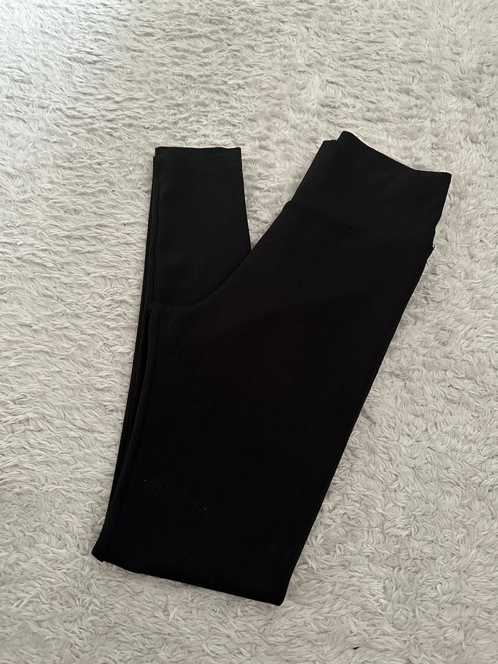 Elastik belli, siyah, sentetik kumaştan yapılmış, normal boy midi tayt. Günlük sokak stili için uygun, trend bir parça.