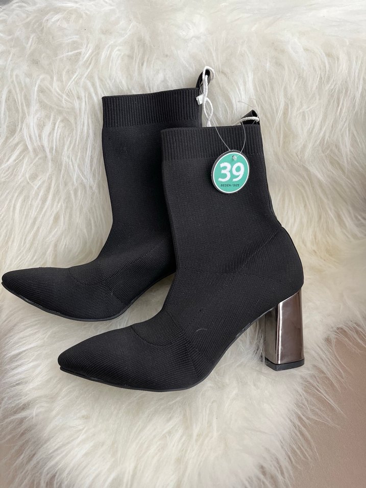 Siyah elastik üst kısmı ve blok topuklu kauçuk kadın botlar, rahat sokak tarzı için uygundur. 39 -40 numara giyenler için uygun kalıbı geniş