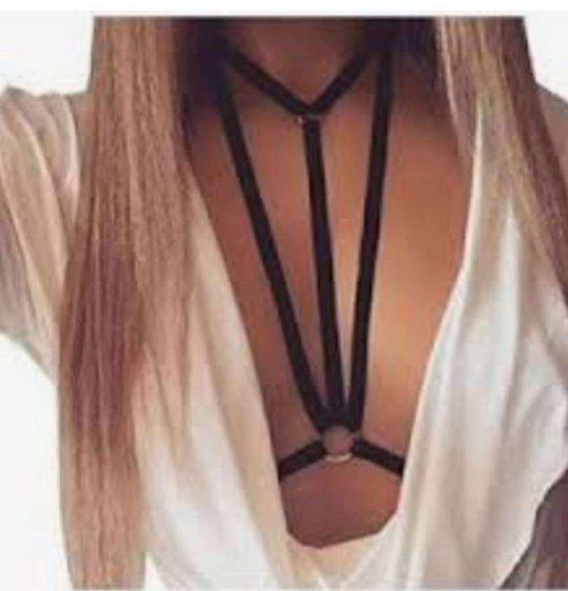 Siyah elastik malzemeden yapılmış, gotik tarzda kadın vücut zinciri. Cesur ve desensiz tasarımıyla parti için uygundur. #büstiyer #bra #bralet #dantel #sütyen #vücutkemeri #vücutbandı #bacakkemeri #bacakaksesuarı #sütyenaksesuarları#vücutkemeri tamamen lastiktir. #gelin #gelinlik #sexy #içgiyim