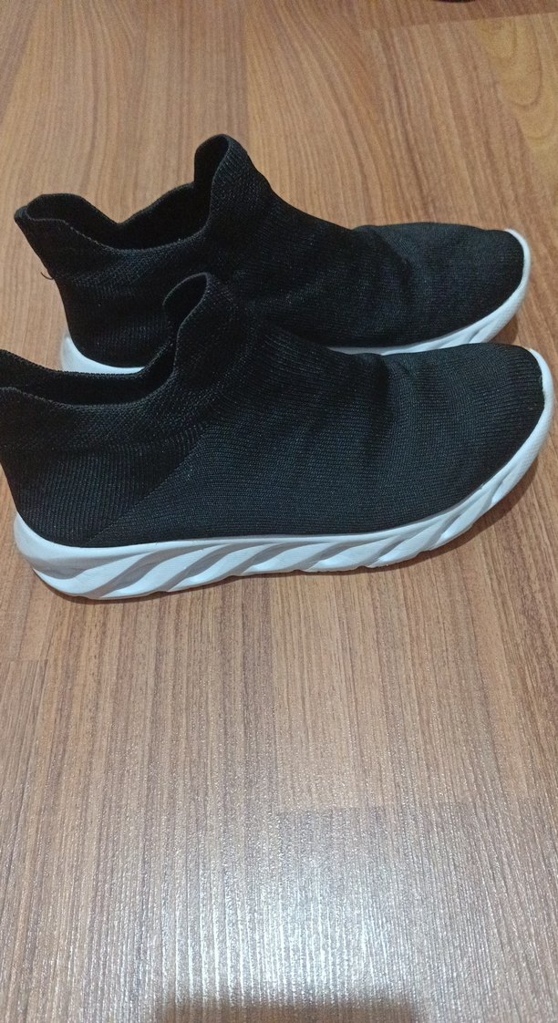 Siyah kumaş ve beyaz kauçuk tabanlı, kadın spor ayakkabısı.