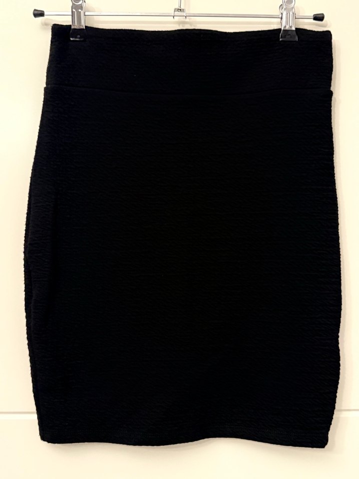 Siyah, vücuda oturan midi etek. Minimalist ve goth tarzıyla ofise, sosyal yaşama uygundur.