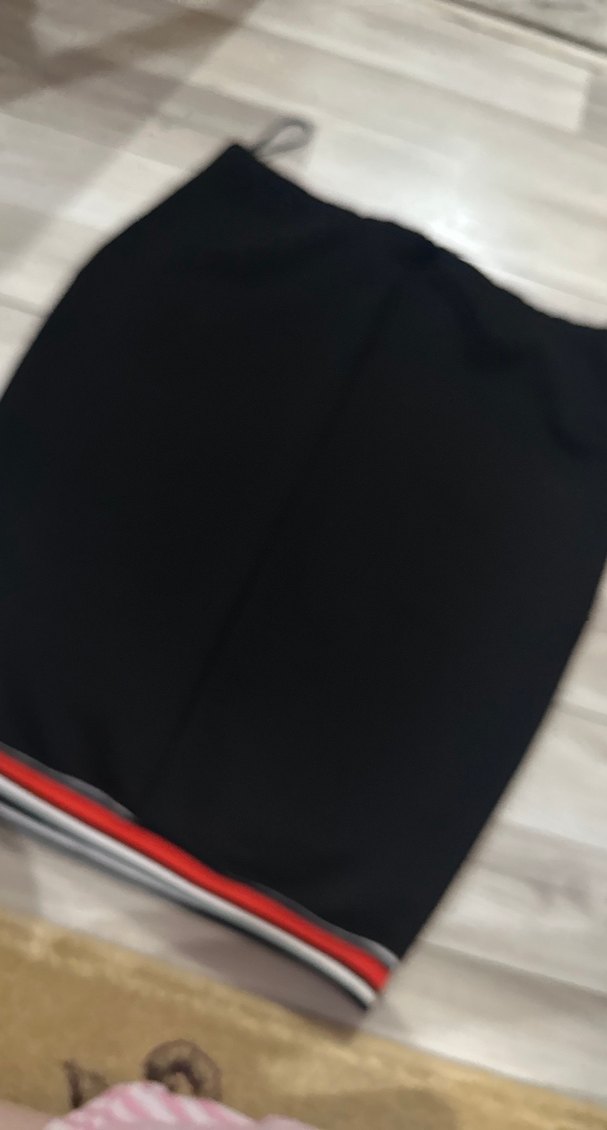 Siyah, elastik bel bantlı ve sportif çizgili etek ucu detaylı, sentetik kumaştan yapılmış dar kesim mini etek.