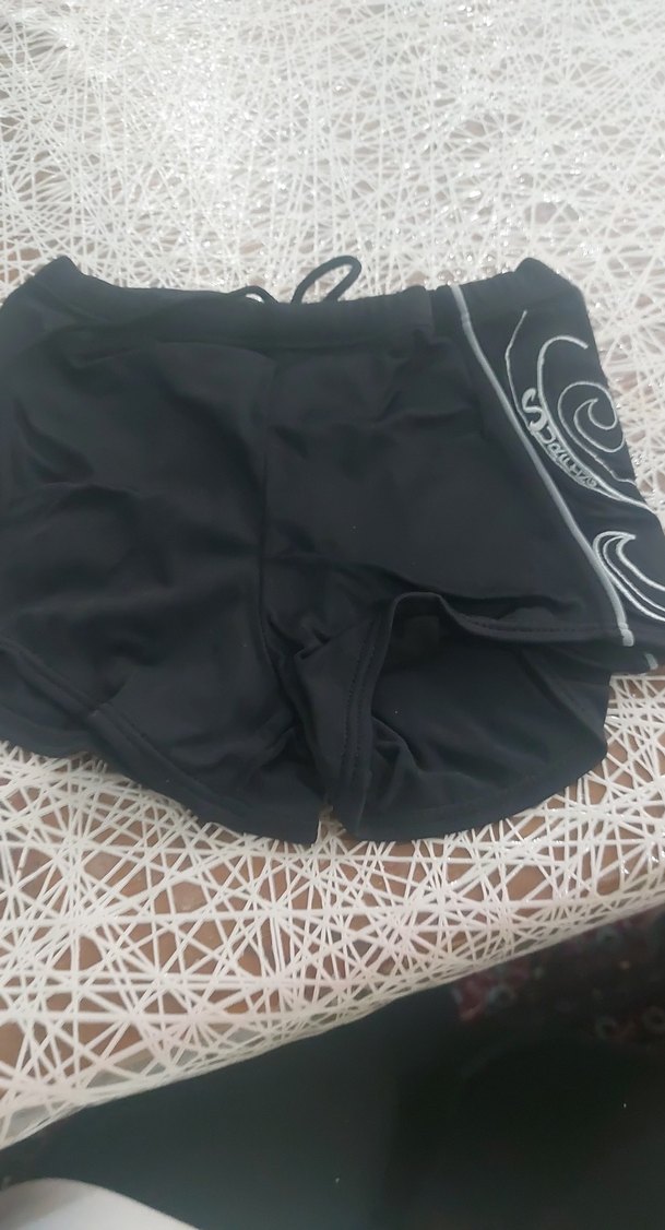 Siyah, elastik bel bantlı, sentetik kumaştan mayo şortu. Cesur goth tarzında plaj için uygundur.