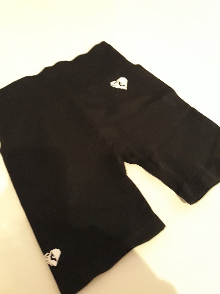 Siyah, elastik bel bantlı, yumuşak sentetik kumaştan yapılmış hamile şortu. Mini boyda, spor için uygun, gotik athleisure tarzında.