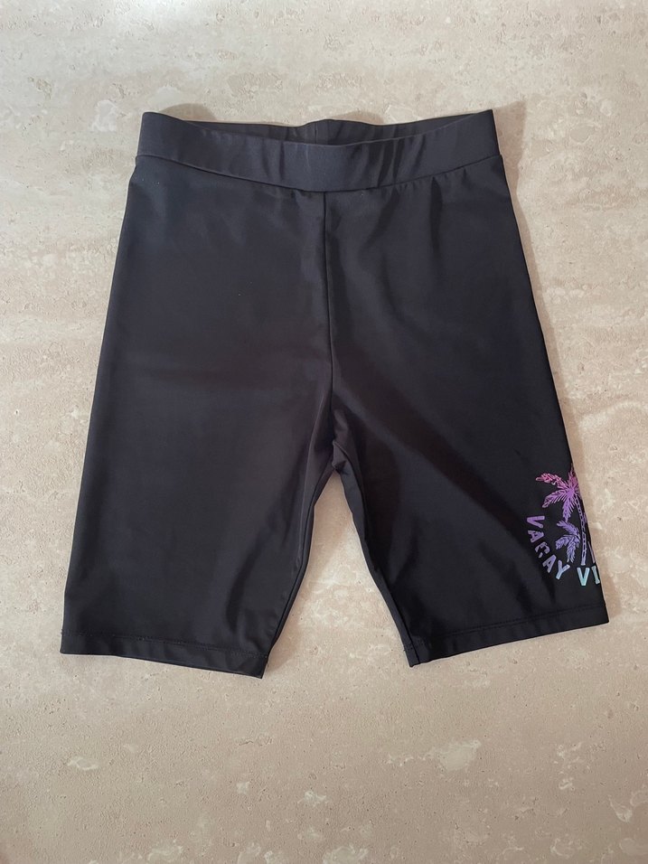 Siyah, elastik bel bantlı, kısa ve vücuda oturan hamile şortu, spor yaparken rahat kullanım sağlar.