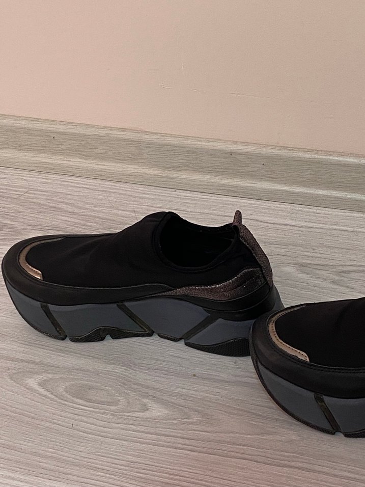 Siyah elastik üst kısmı ve platform kauçuk topuklu kadın spor ayakkabısı, sokak stili ve günlük kullanım için uygundur. Moda öncülerine hitap eder.