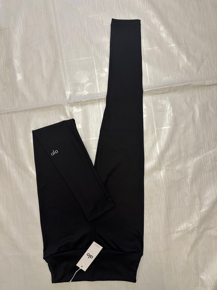 Siyah, elastik bel bantlı, düz ve uzun tayt. Spor ve sokak stili için uygun, yumuşak sentetik kumaştan yapılmıştır.