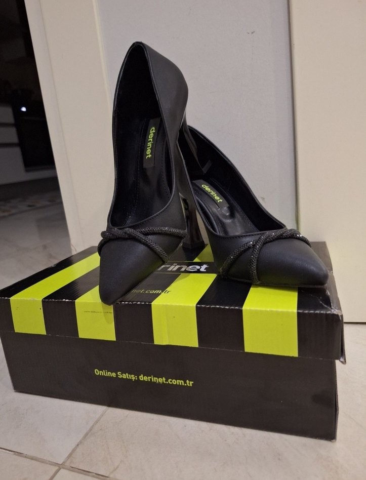 Derinet Marka,siyah,sivri burunlu ve elastik detaylı topuklu stilettolar. Cesur, çağdaş iş tarzına uygun, ofis kullanımı için ideal.