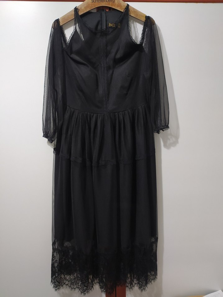 Siyah salaş omuzları düşük model tül kollu elbise.