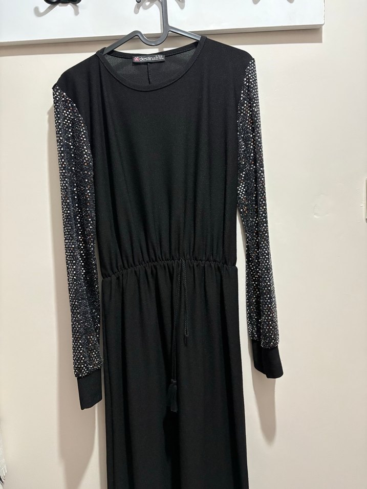 Siyah uzun kol ve payet detaylı, bol kesim uzun elbise 38-40 uyumludur hiçbir hatası yoktur