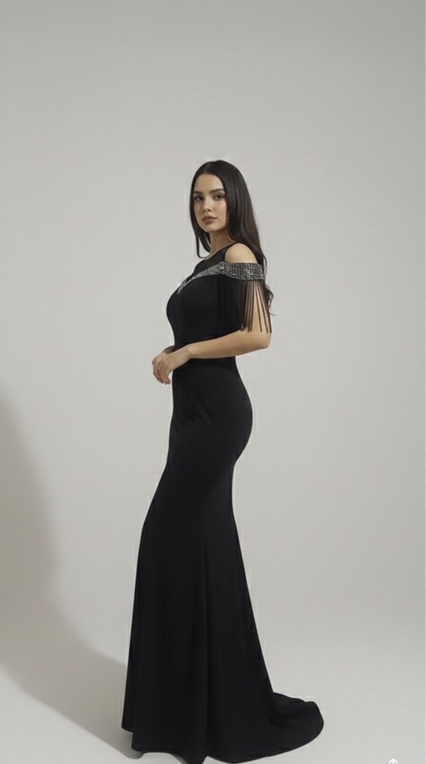 Bir kere kullanıldı 40-38 beden uygundur. İlk 2 fotoğraf aı ile üretilmiştir. Siyah uzun abiye elbise, kolları bana geniş gelmişti daralmıştım içinde daraltma payı duruyor. Kendi vücudunuza göre ayarlatabilirsiniz.