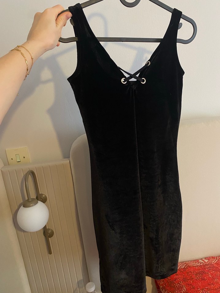 Siyah, vücuda oturan mini elbisedir. Bir kez giyildi yepyeni kadife kumaş