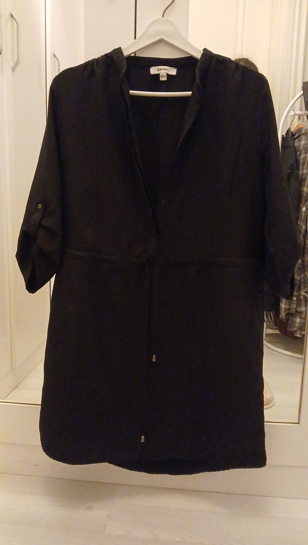 Düğmeli, siyah midi boy elbise. Rahat kesim ve ipeksi dokuda, ofis için uygun.