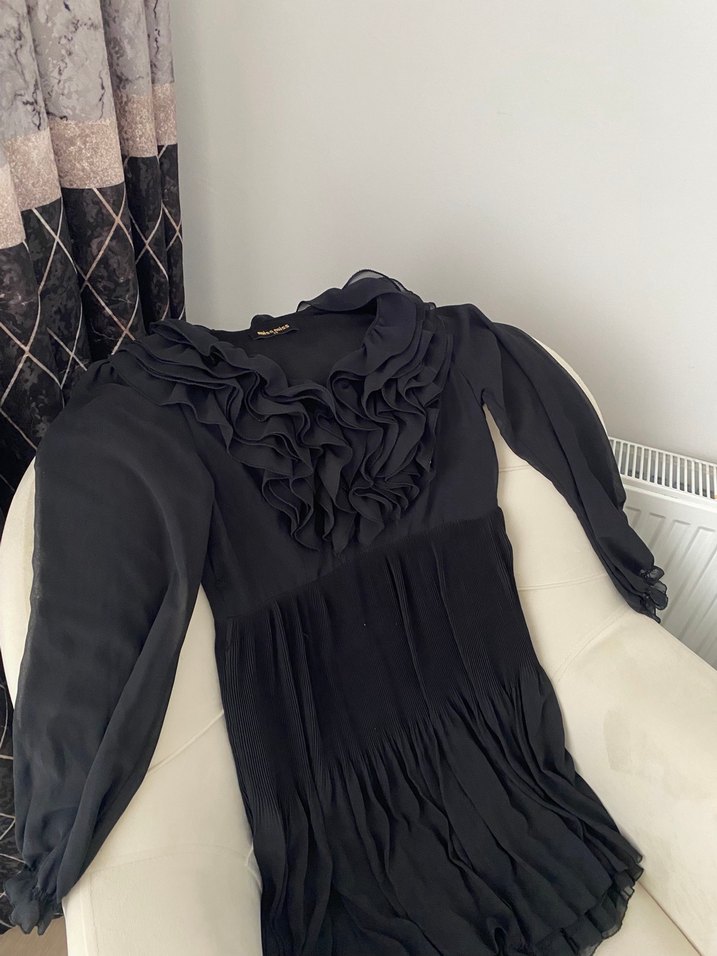 Uzun kollu, V yakalı ve fırfır detaylı elbise iade yok