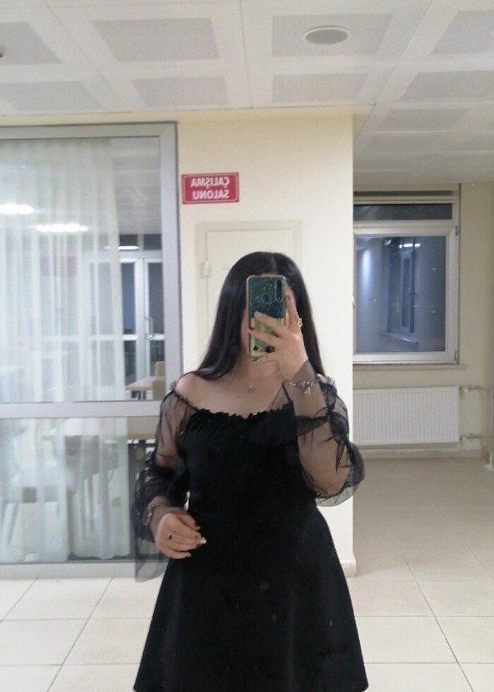 Kolları tüllü, dizin biraz üstünde. Sadece 1 defa giyildi. Hiç bir sorunu yoktur.