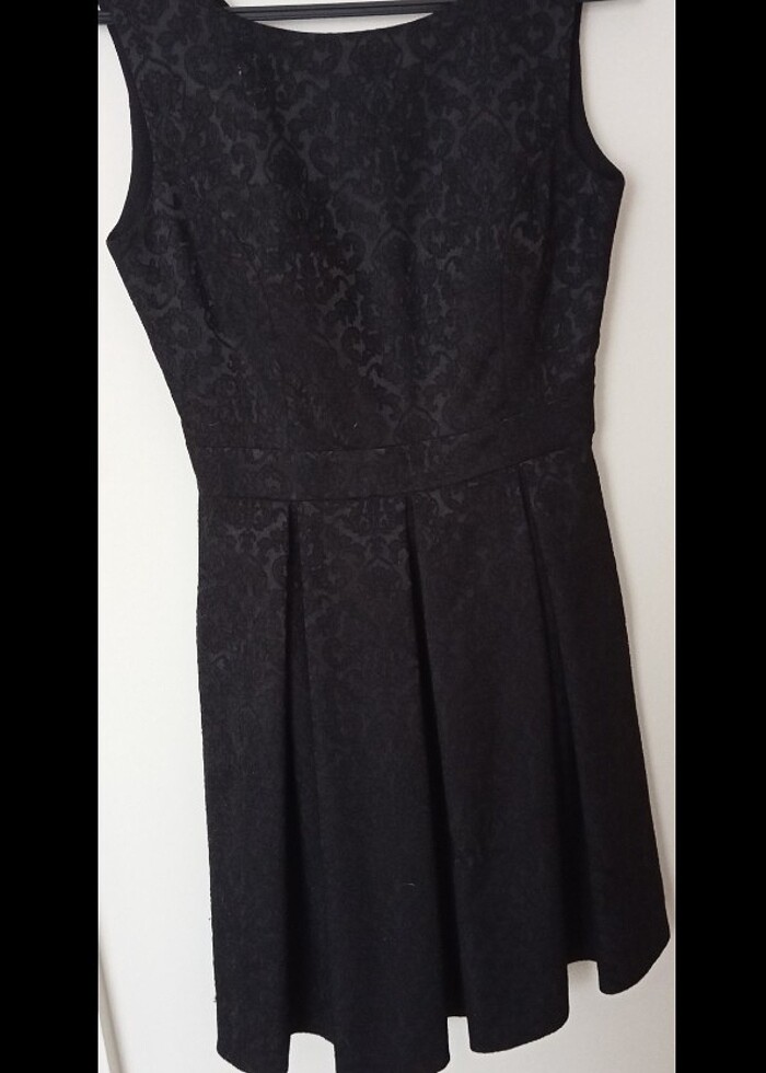 Önü kare yaka arkası v şeklinde , eteği pileli, üstte çok güzel duran bir elbise, ofiste, akşam yemeğinde, kokteylde giyilebilir joker bir elbise sade ve şık, kendinden desenli, astarsız, renk doygun siyah, beden 36,kusuru yok, 2 kere giyildi.