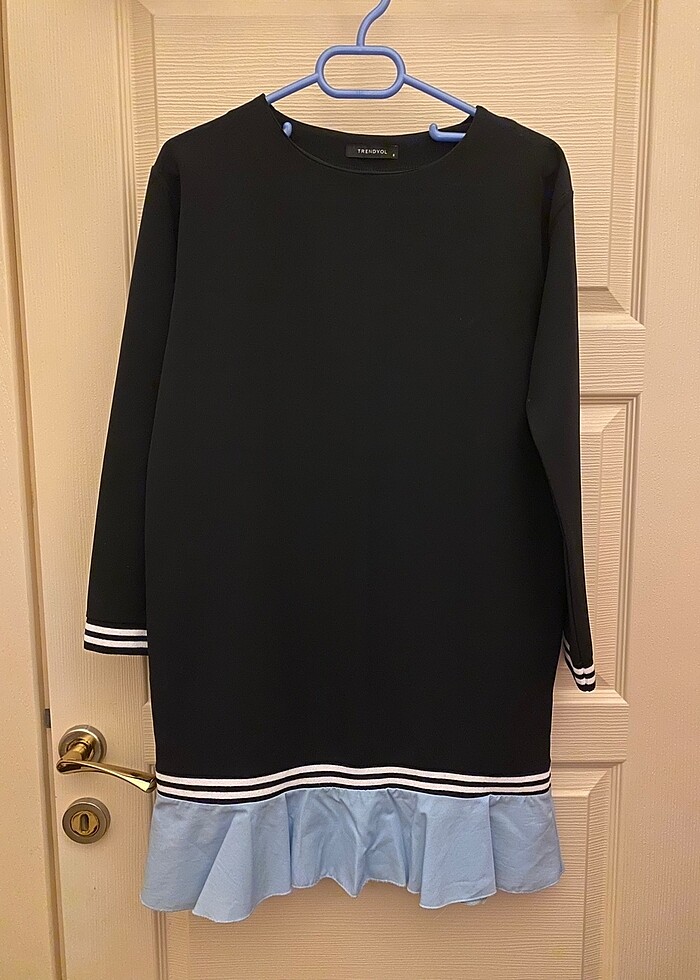 Siyah, uçları mavi kumaş fırfırlı elbise. S beden