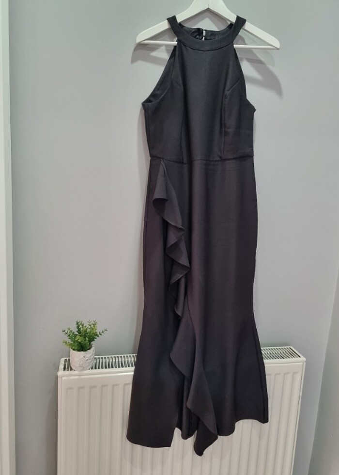Siyah halter yaka detay etek kısmı yırtmaç ve volan detaylı elbise