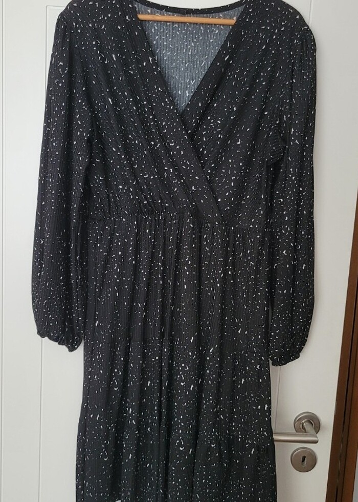 Siyah üstüne beyaz desenli, uzun kol, diz boyu, jarse şık elbise