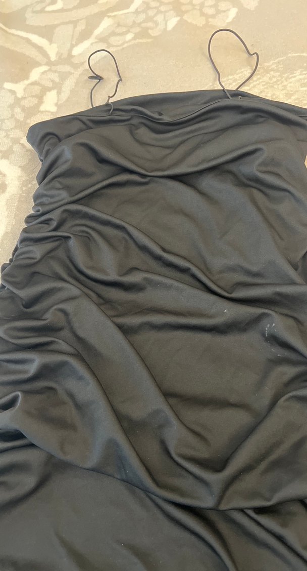 Drapeli tasarıma sahip siyah, fitted hamile eteği, pürüzsüz sentetik kumaştan ve minimalist goth tarzda, romantik akşamlar için uygundur.