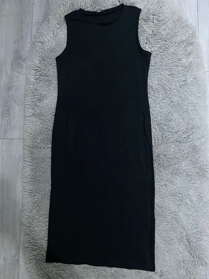 Kalın askılı bisiklet yakalı ve vücuda oturan siyah elbise, yumuşak sentetik kumaştan üretilmiş, minimal ve rahat şıklık sunar.