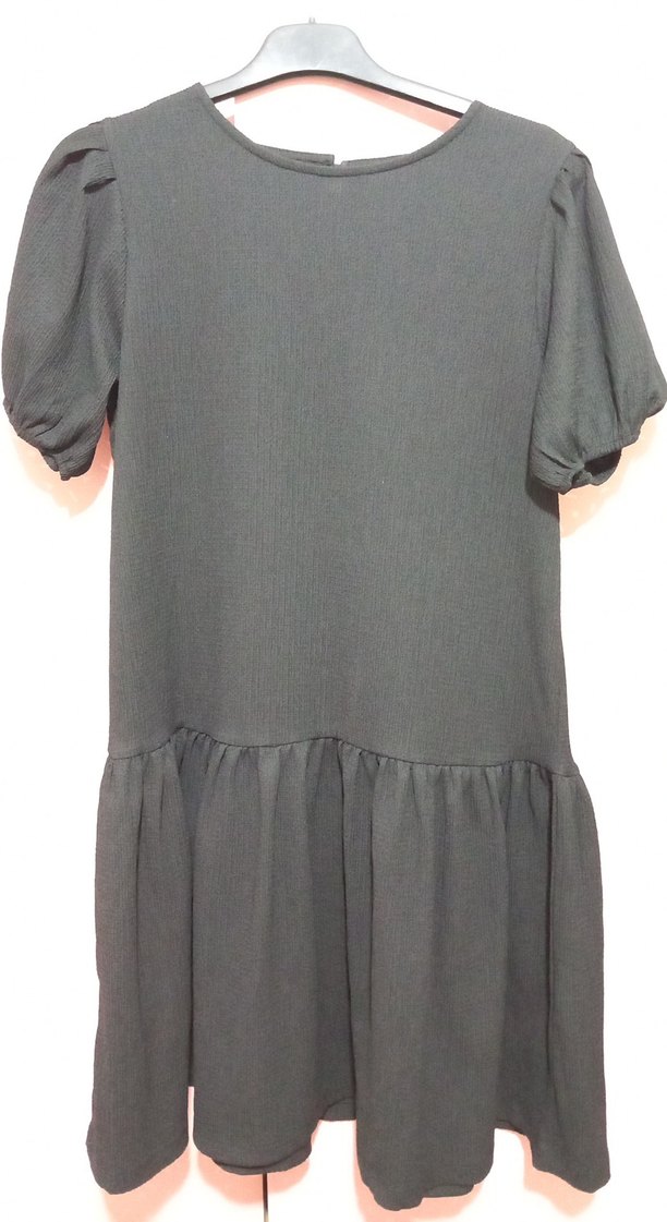 siyah elbise, bol kesim ve pile detaylı, kısa kollu. Yuvarlak yaka ve minimalist normcore tarzda, günlük kullanıma uygun.