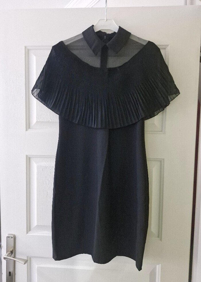 Siyah kısa elbise diz üstüdür 38 beden Omuz bölgesi sifon gelir Kibar ve sıktır Boy Omuzdan aşağı 92 cm Bel 38 cm ( çift yönlü 76 cm )