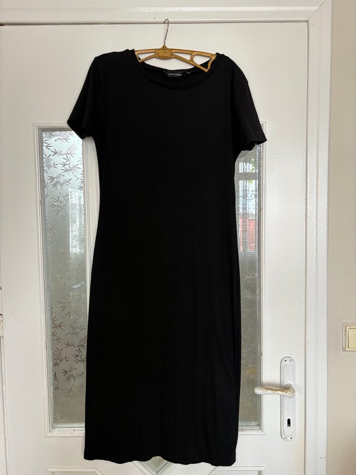 Siyah, kısa kollu, midi boy, vücuda oturan elbisesi. Satenimsi kumaştan, minimal ve gotik tarzda, ofis için uygun, zahmetsiz şıklık sunar.