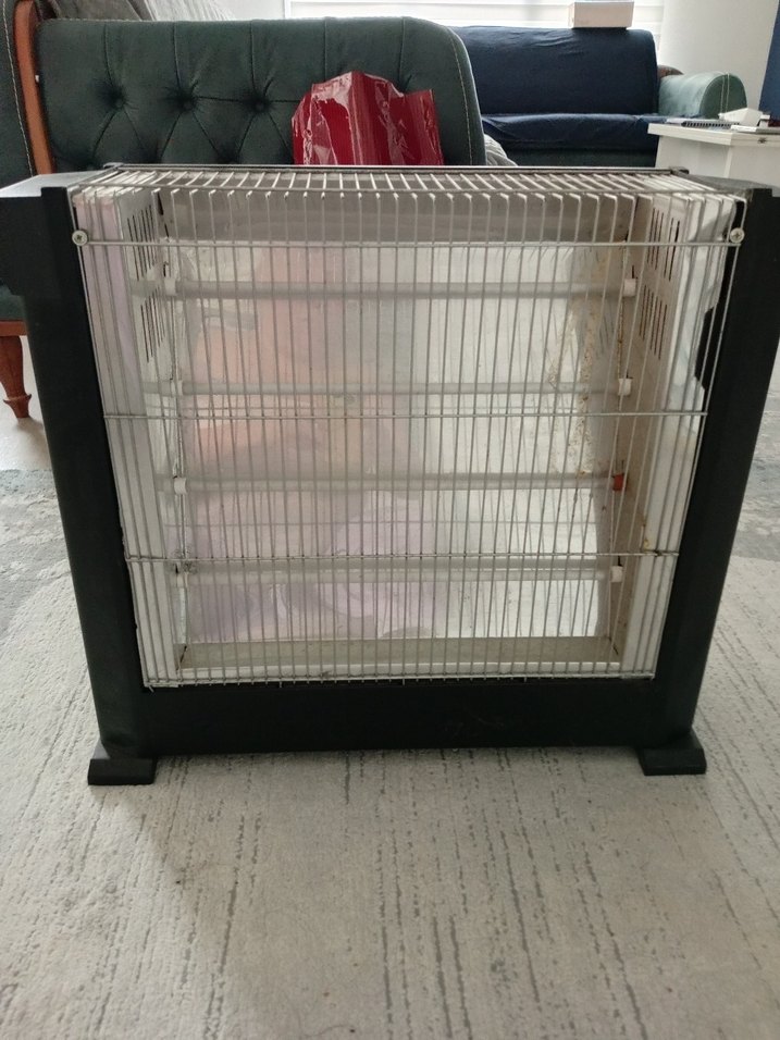Koruyucu metal ızgaralı ve sağlam tabanlı siyah elektrikli ısıtıcı, iç mekan kullanımı için uygundur. Verimli ısı sağlar.