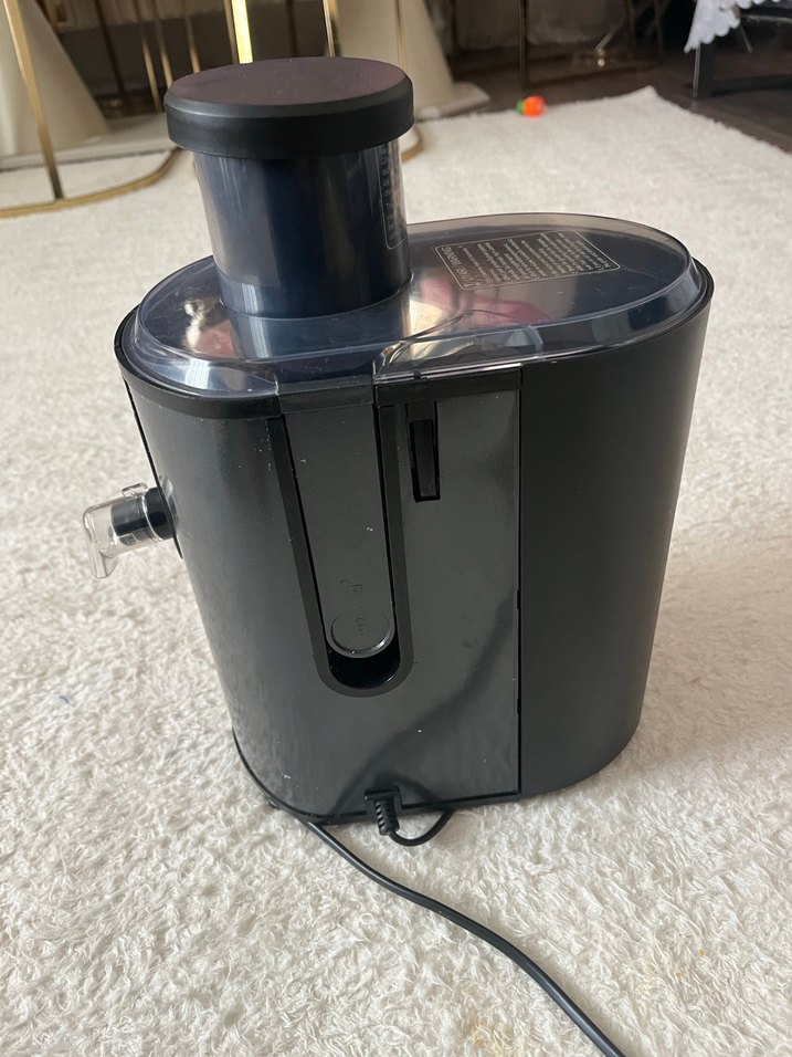 Siyah elektrikli meyve sıkacağı, geniş besleme haznesi ve kolay meyve suyu dökme için çıkışa sahiptir. Kablo ile çalışır.