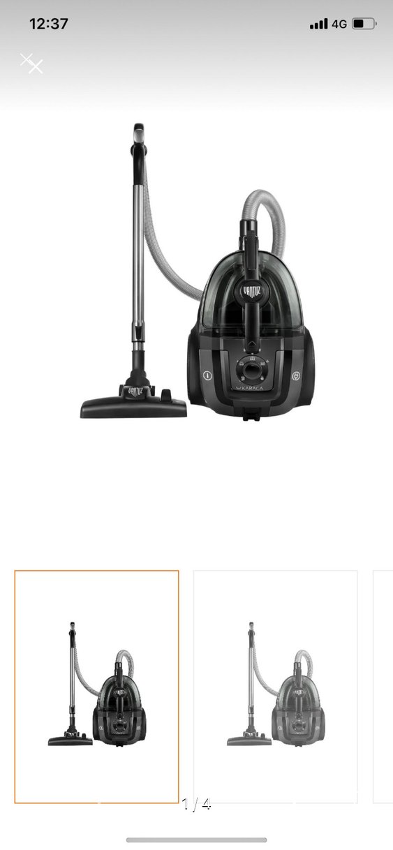 Kompakt tasarımlı siyah elektrikli süpürge, ayarlanabilir emiş gücü ve esnek hortum ile standart zemin başlığına sahiptir.