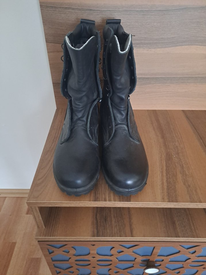 Siyah deri malzemeden yapılmış, , sade ve minimalist gotik tarzda erkek asker botları, günlük kullanıma uygun.