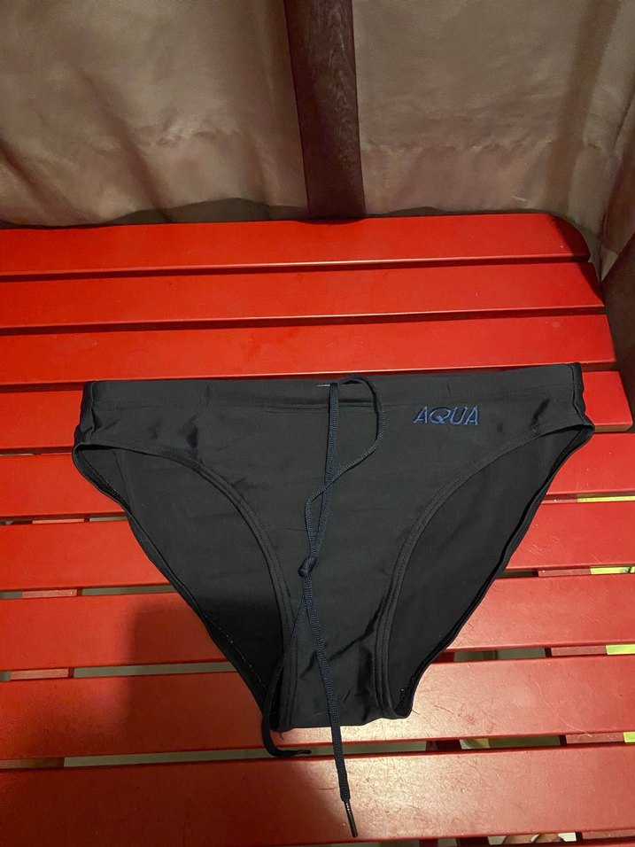 Siyah, elastik bel bantlı, 'AQUA' logolu, atletik kesim erkek yüzücü mayosu. Spor ve sokak stiline uygun midi boyda.