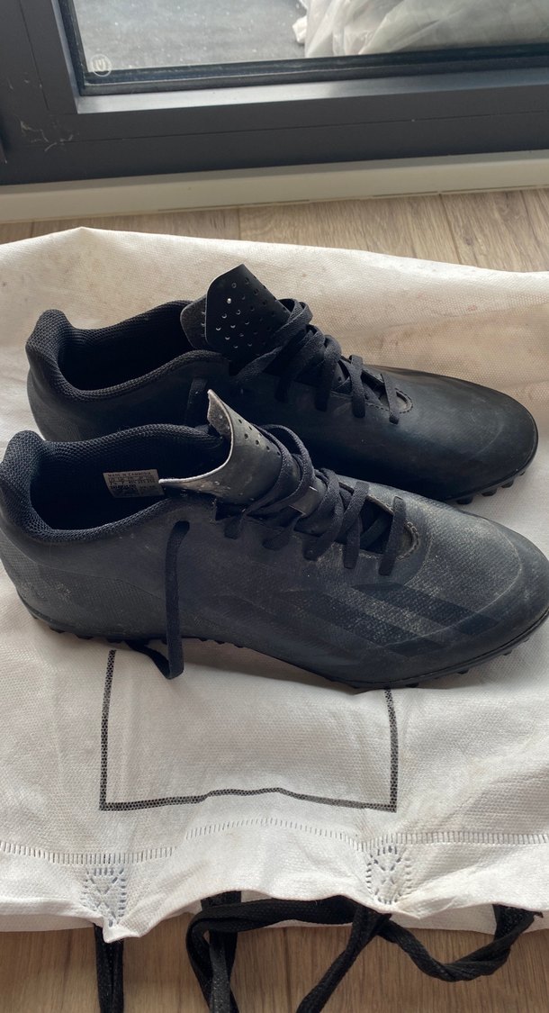 Bağcıklı, dayanıklı kauçuk malzemeden yapılmış siyah erkek futbol ayakkabısı. Spor ve sokak stiline uygun, desensiz şık tasarım. ⚽41,5 numara az kullanıldı