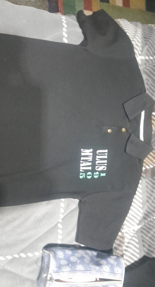 Siyah renkli, kısa kollu, düğmeli yakalı erkek polo tişört. Sentetik kumaştan, baskılı desene sahip, normal kesim ve günlük kullanıma uygun.