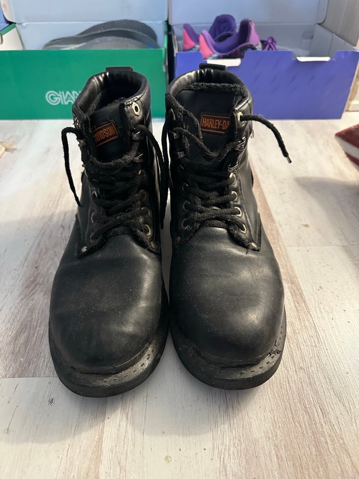Siyah kauçuk erkek biker botları, metal tokalı ve bağcıklı, günlük kullanım için uygun, desen içermeyen sade tasarım.