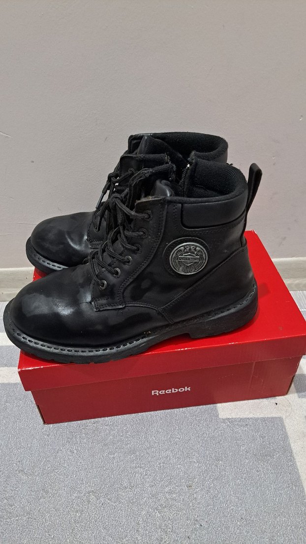 Siyah, tokalı, lastik malzemeden yapılmış biker tarzı erkek botları. desen içermeyen, grunge punk havası taşıyor.