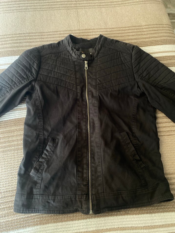 Siyah, fermuarlı, erkek biker ceket. Keten kumaştan, uzun kollu ve paça yakalı, günlük sokak stiline uygun.