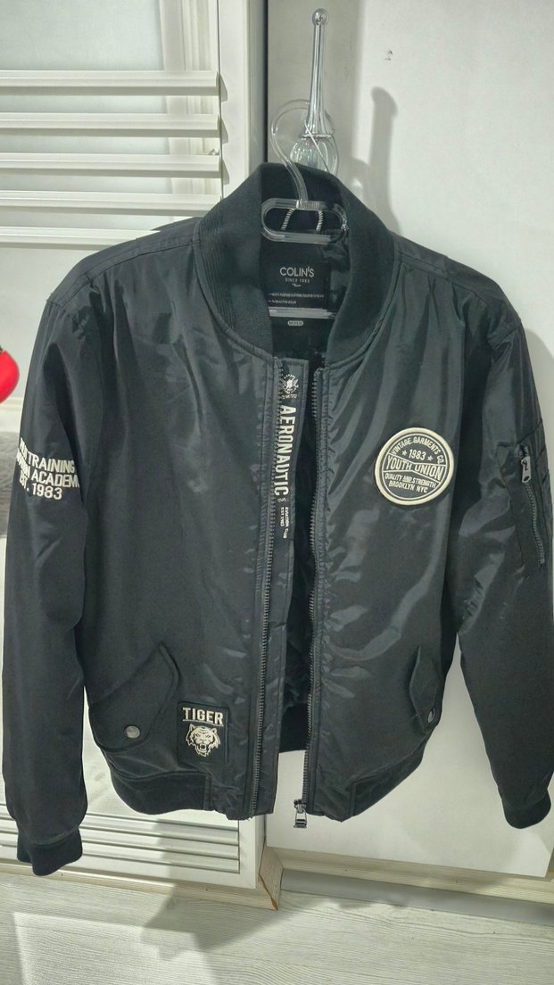 Fermuarlı, baskılı detaylara sahip siyah deri biker ceket. Uzun kollu, bisiklet yaka ve vücuda oturan kesimle günlük kullanıma uygun.