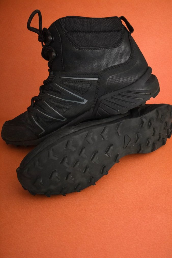 Siyah kauçuk malzemeden yapılmış, Velcro kapamalı erkek biker botları. Dış mekan kullanımı için uygun, desen içermeyen koyu renk ve rock punk havası taşıyor.