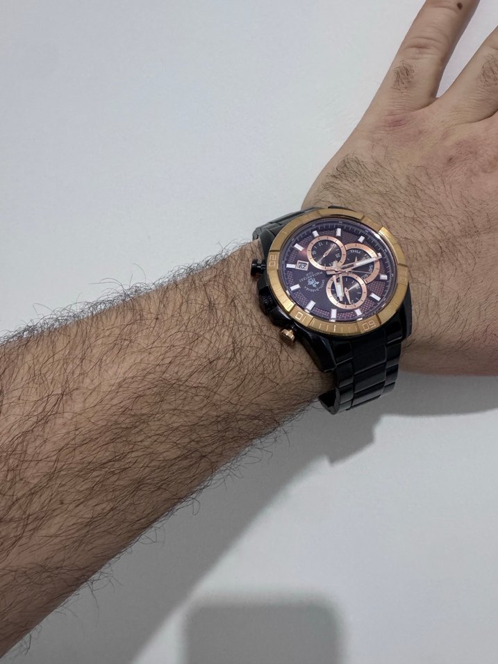 Bu erkek kol saati siyah metal kayış ve çoklu alt kadranlar ile tarih göstergesine sahip, biker tarzını athleisure tasarımla birleştirir. ⌚
