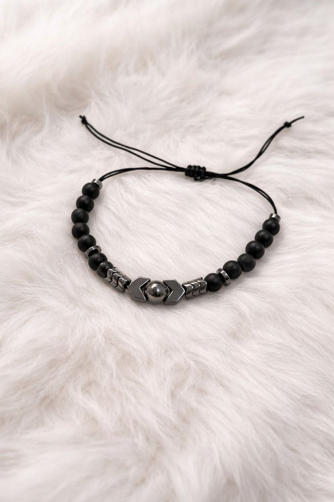 Ayarlanabilir ip detaylı, metal aksanlı siyah erkek bileklik.