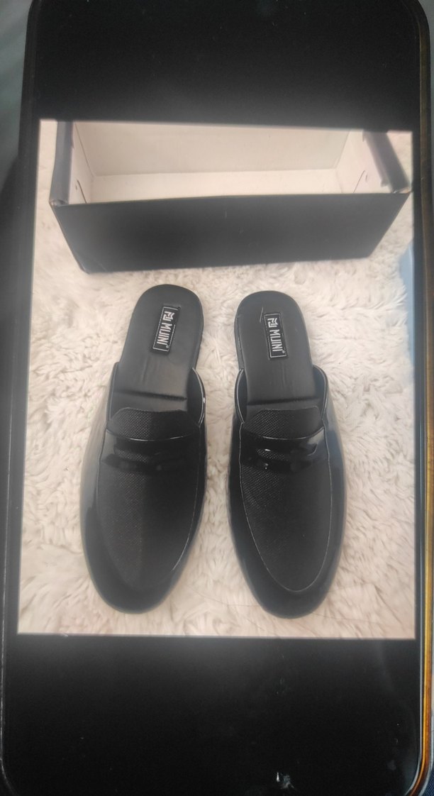Siyah, blok topuklu, kauçuk malzemeden erkek terliği. yeni hiç giyilmedi kutusunda