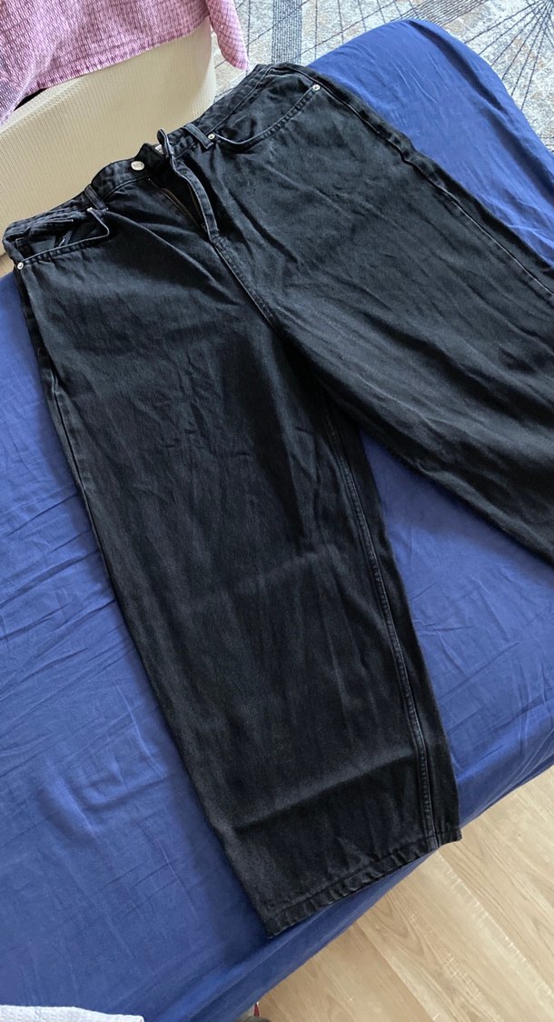 Siyah renkli, bol kesim ve 34 beden Baggy fit kot pantolon. Günlük kullanıma uygun, desen içermeyen rahat ve şık tasarım.