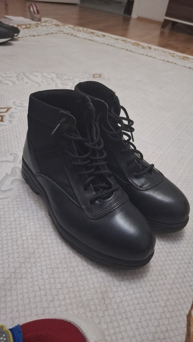 Siyah erkek botlar, kemer detayı ve bağcıklı ön kısmıyla sade iş botu