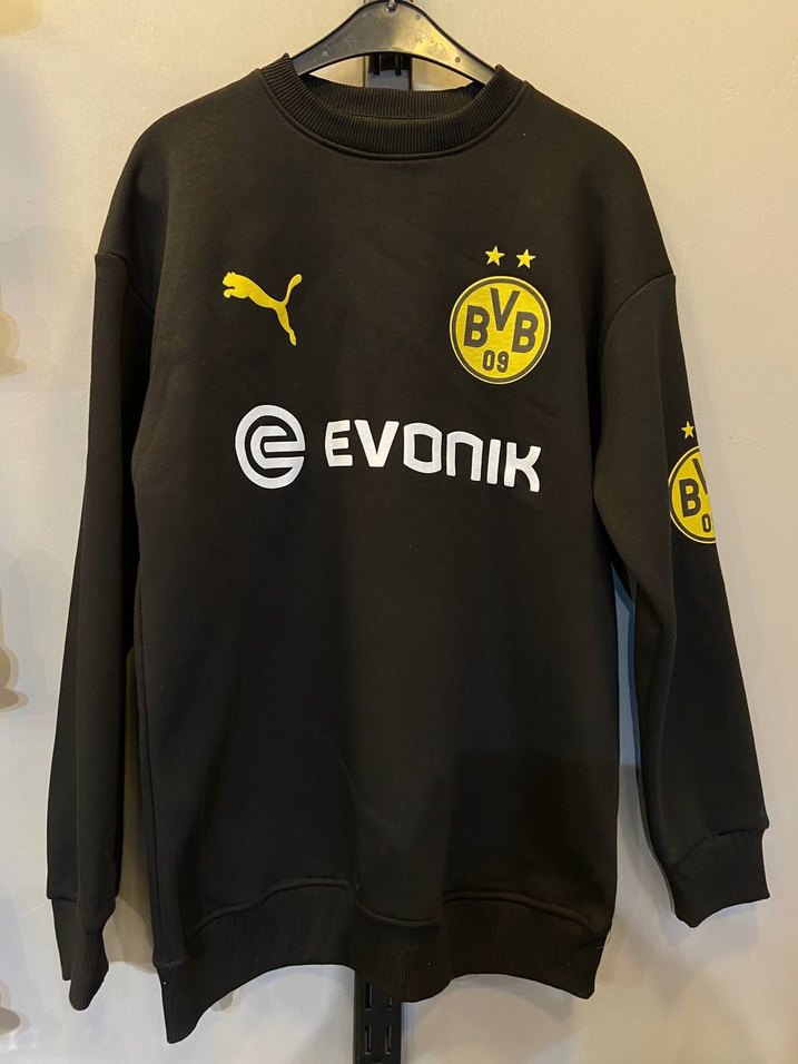 Siyah, uzun kollu, yuvarlak yakalı erkek sweatshirt. Baskılı BVB logoları ve Velcro detaylarıyla rahat ve spor tarzda, günlük kullanım için uygun.
