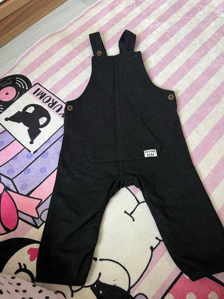 Ayarlanabilir tokalı askılara sahip siyah bol kesim erkek çocuk salopeti. Yumuşak ve sıcak kumaştan, sokak stili için uygun. Desensiz tasarım rahatlık ve şıklık sağlar.